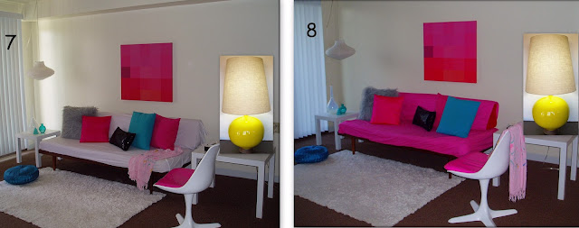 Turquoise lamp and ottoman look fab with yellow table. I need that lamp. And that painting. Image via HGTV.